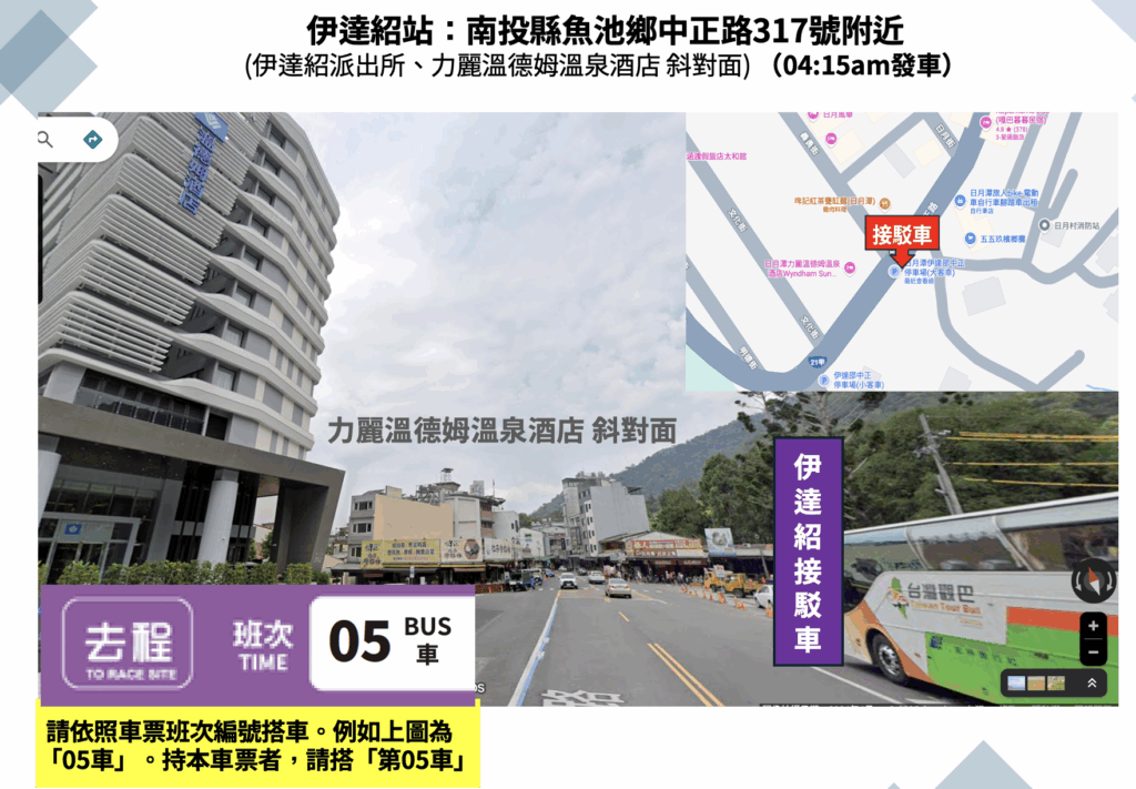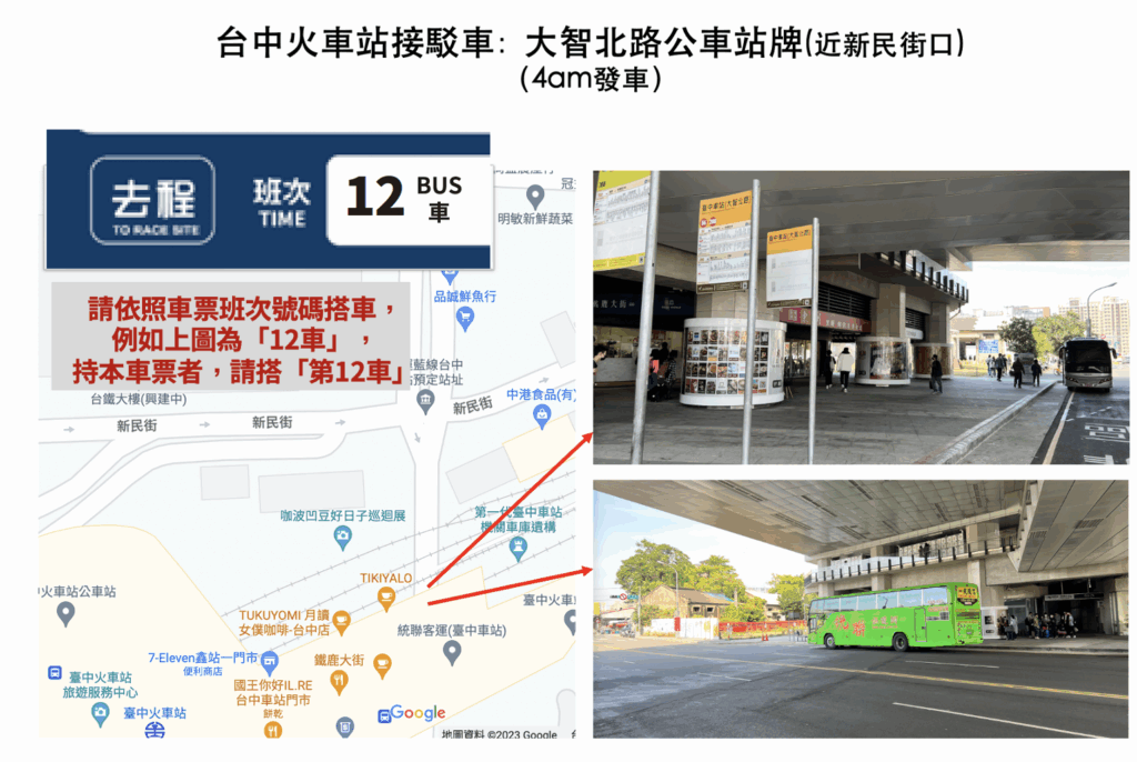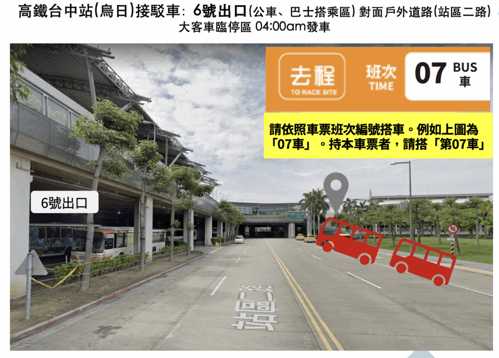 台中火車站、高鐵台中站、伊達紹站均為付費接駁車,請憑票上車(現場無售票),請依照車票上的「車次編號」上接駁車。例如「06車」請搭第6車。